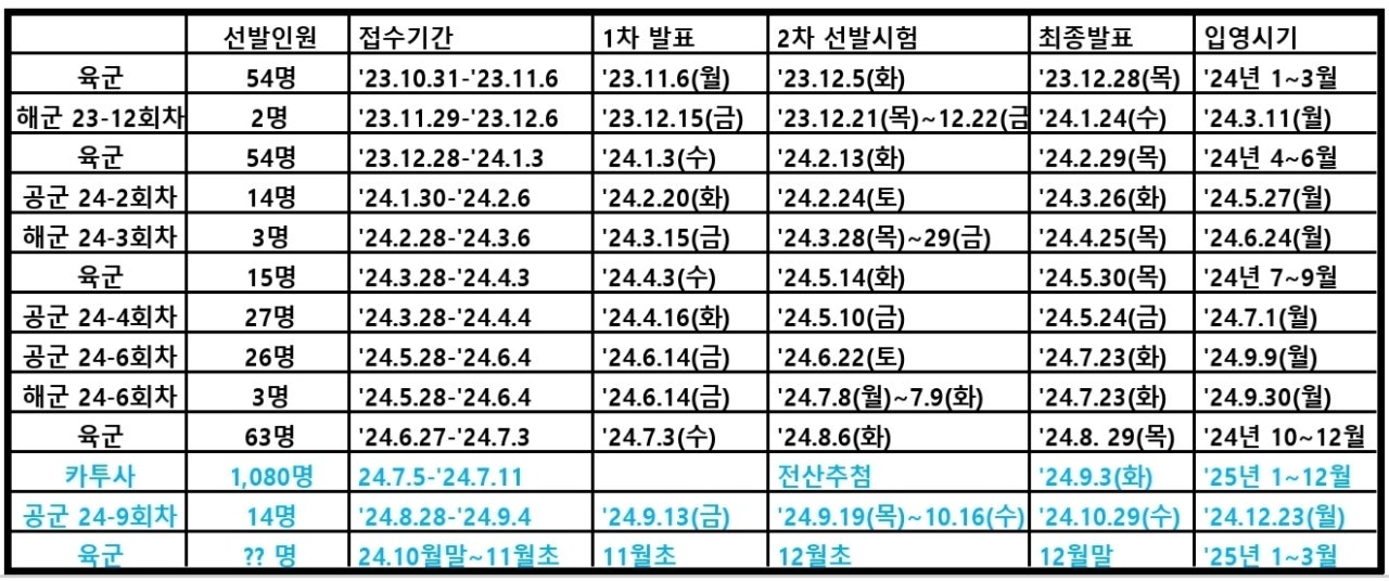 다음 육군어학병 지원접수는 내년도 입영시기로 아직 선발계획 공지가 나오지 않았습니다. 예년처럼 진행된다면 10월말~11월초 지원접수, 2차 선발시험은 12월 초로 예상합니다. (2025년 1~3월 입영)