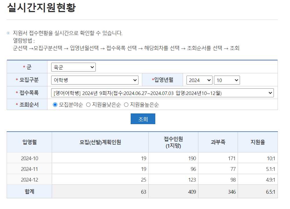 ■모집 일정 ⇒접수기간 : 2024. 6. 27.(목) 14:00 ~ 2024. 7. 4.(목) 14:00 ⇒1차 선발자 발표 : 2024. 7. 16.(화) 10:00 * 1차 선발자는 수험표를 확인(출력)하여 면접, 신체검사 등 전형일정에 참석하셔야 합니다. (불참 시 선발제외 처리) * 또한, 1차 선발자는 합격 특기가 본인이 지원한 특기(1지망, 2지망, 3지망)가 맞는지 수험표 등을 통해 반드시 확인하시기 바랍니다. ⇒최종 선발자 발표: 2024. 8. 23.(금) 10:00