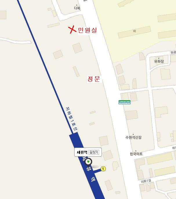 정문에서 조금 더 걸어가면 민원실이 있습니다. 여기로 가시면 됩니다.