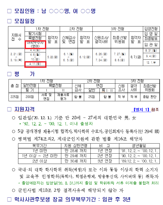 공군어학병 시험: 2020년 3월 6일(금) 12:00 2020년 4월 10일(금) 12:00 공군 27예비단 2교육대 (경기 수원시)