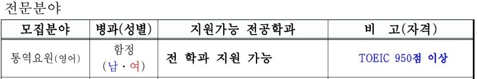해군통역장교 어학성적은 토익 950점만 명시되어 있는데, 토플, 텝스도 지원 가능합니다. (환산표 적용, 토익 950, 토플 112, 텝스 862, 뉴텝스 496입니다.)