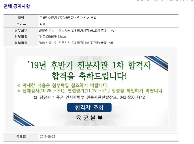 | 2019년 후반기 육군 통역장교-전문사관 2차 평가 안내 공지 (0) | 2019.10.25 |