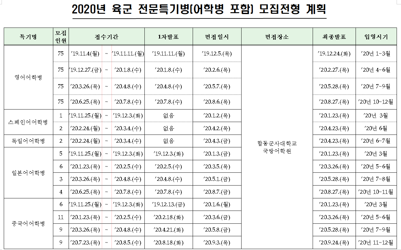 2020년 입영대상 어학병 모집 계획은 아래를 참고하세요.