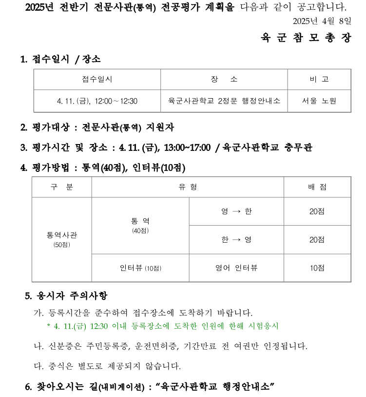 2025년 상반기 통역사관 전공평가 계획 공지입니다.