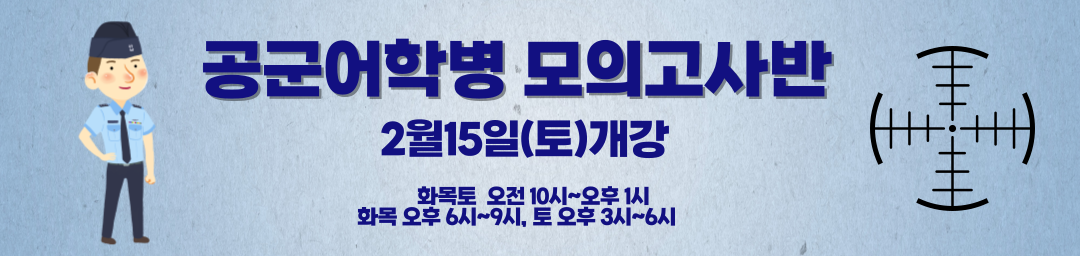 | [학원 대면수업] 공군어학병 모의고사반: 2/15(토) 개강 (0) | 2025.01.25 |