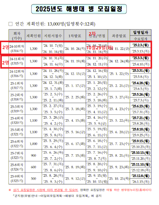 2025년 해병대 병 연간 모집일정을 안내드립니다.