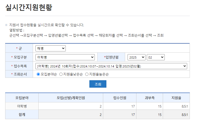 | 해군통번역병 2024년 10회차 실시간 지원현황 (지원 접수 마감) (0) | 2024.10.11 |