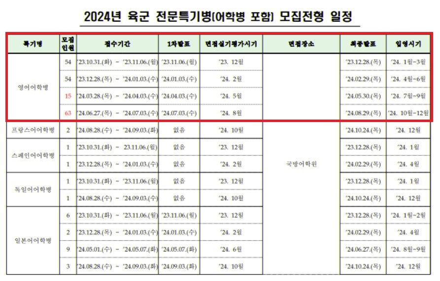 2024년도 하반기 육군어학병, 공군어학병, 해군통번역병 모집일정 (영어어학병)