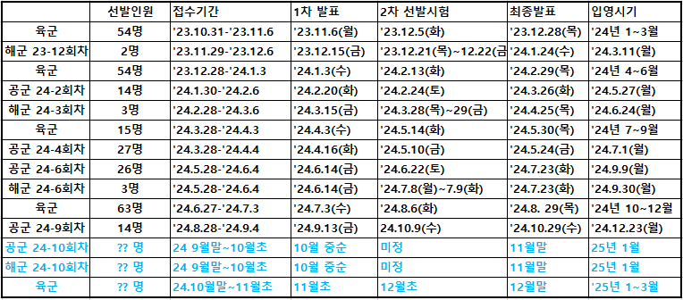 공군병 10회차, 해군병 10회차 일정은 작년 일정으로 추측한 일정으로 2025년 1월 입영 일정이나 계획은 아직 알 수 없습니다. 9월말~10월초 선발공지가 나와봐야 10회차에 공군어학병 또는 해군통번역 선발이 포함되는 지 여부를 알 수 있습니다.
