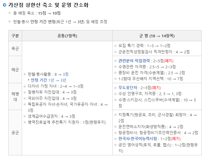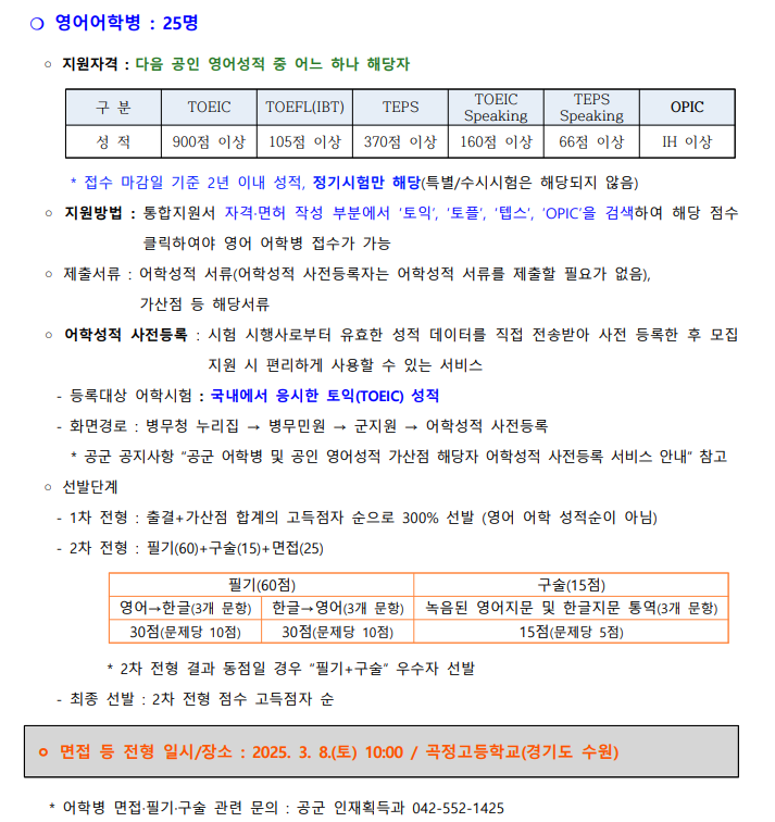 | 공군어학병 2025년 10회차 접수부터 변경되는 가산점 상한선 축소 및 운영 간소화 (0) | 2025.02.04 |