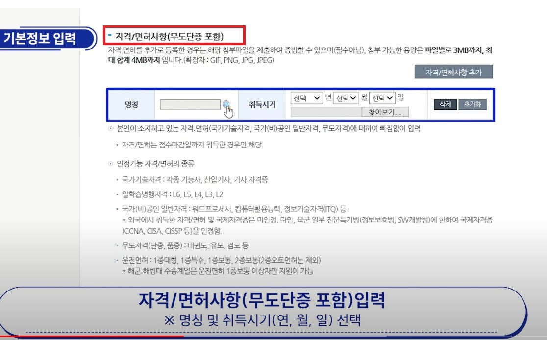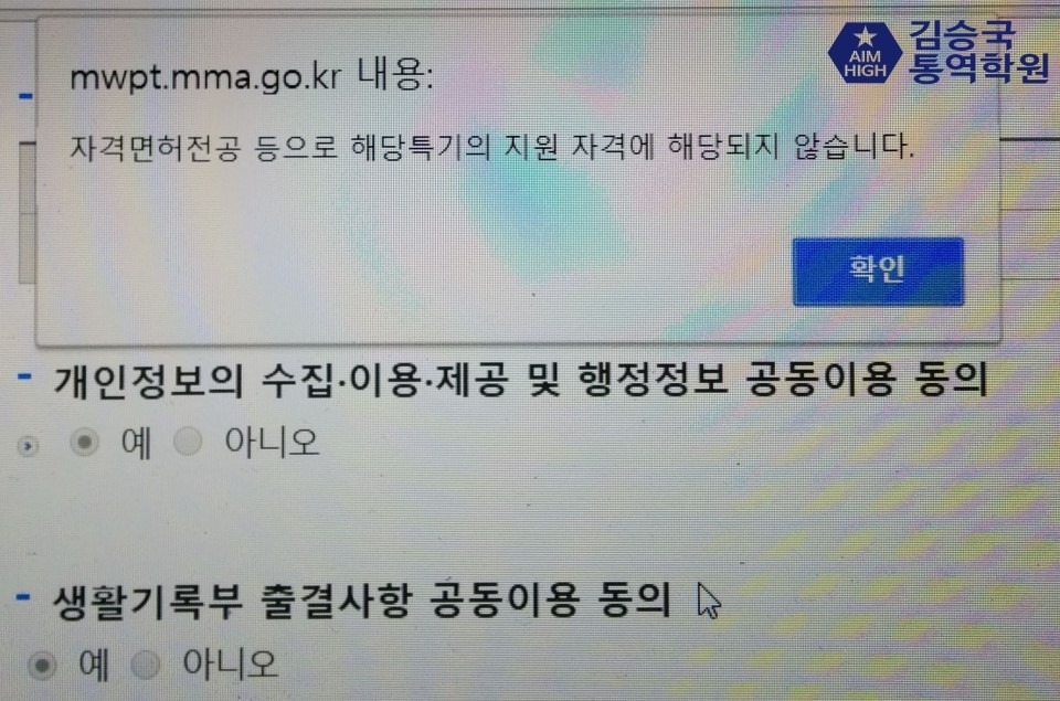 공군어학병 지원을 위해 병무청 사이트에서 통합지원서 작성 후 "자격면허전공 등으로 해당특기의 지원 자격에 해당되지 않습니다"라는 오류가 나오는 경우가 많이 있습니다. (학력 사항 입력 후, 자격/면허사항 입력란이 나옵니다)