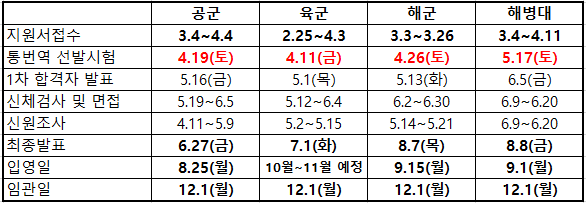 각군 모집 홈페이지에 올라온 일정을 취합한 2025년 상반기 통역장교 선발 일정이며 정확한 세부 일정은 각군 내부상황에 따라 변동될 수 있습니다.