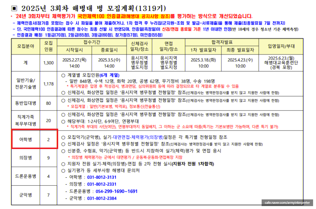 | 해병대 어학병 지원자격 및 모집안내 (2025년) (0) | 2025.02.22 |
