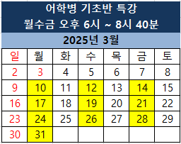 | [학원대면수업] 어학병 기초반 특강: 3/10(월) 개강 (0) | 2025.02.26 |