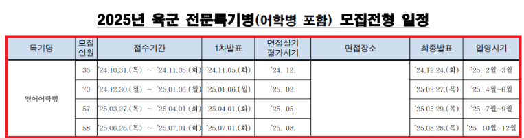 5. 육군 영어어학병 지원 접수 10월말~11월초, 내년도 1~3월 입영 대상으로 10월 초 정도에 내년도 계획이 나올 것으로 예상합니다.