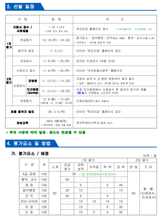 아래는 각 군 모집 홈페이지에 게시된 일정을 취합한 내용입니다. 정확한 세부 일정은 각군 내부상황에 따라 변동될 수 있습니다.