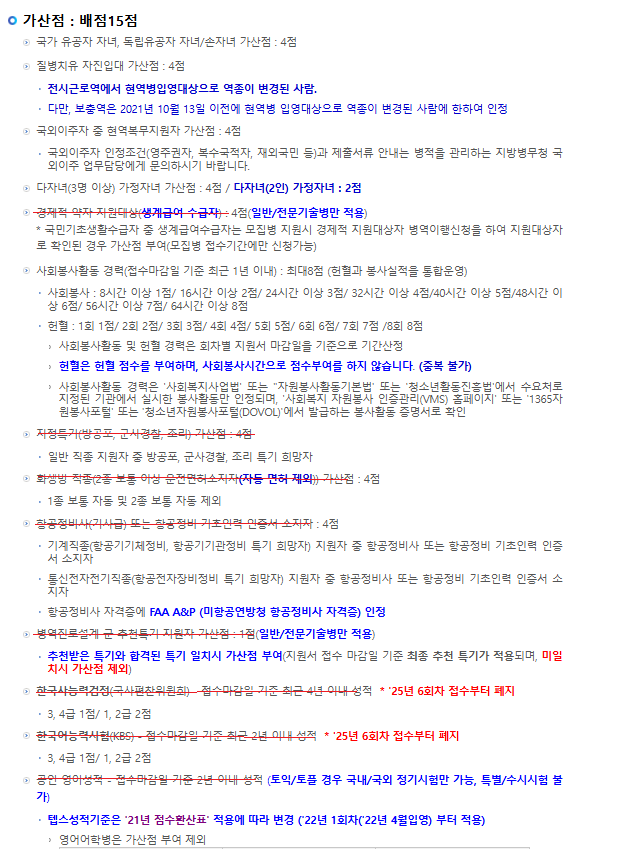 1. 공군어학병 지원시 가산점이 최대 15점까지 적용되는데, 6회차 지원부터 한국사능력검정과 한국어능력시험 가산점이 폐지되었습니다.
