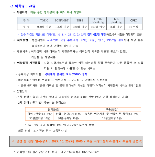 | 공군어학병 (25-10회차) 선발공지 (지원접수 9/29-10/20) (0) | 2025.09.26 |