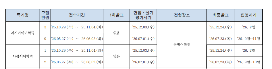 | 육군어학병 연간 모집일정 안내 (2026년 입영) (0) | 2025.09.27 |