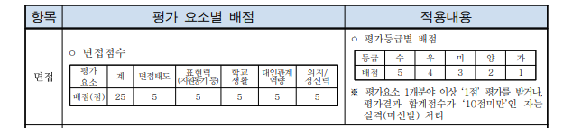 * 면접전형(25점) : 용모/태도, 표현력, 학교생활, 성장환경, 의지/정신력
