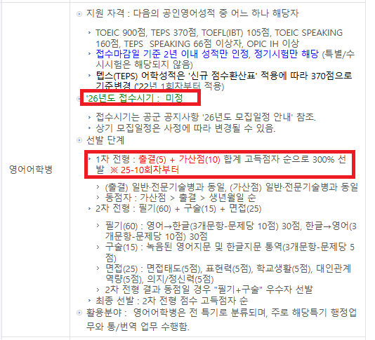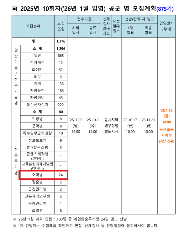 '26년 1월 입영(25-10회차) 공군 병 모집안내가 나왔습니다. 이번 10회차에 공군 영어어학병이 포함됩니다.