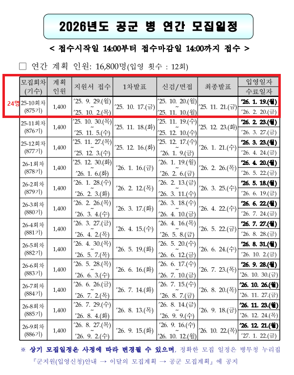 | 2026년 공군병 연간 모집일정 (0) | 2025.09.20 |