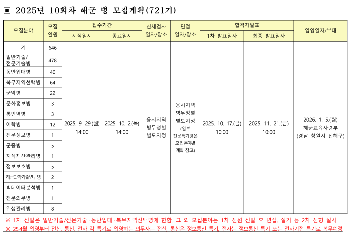 □ '26년 1월에 입영하는 25-10회차 해군 병 모집계획을 다음과 같이 알려드리니 많은 지원 바랍니다.