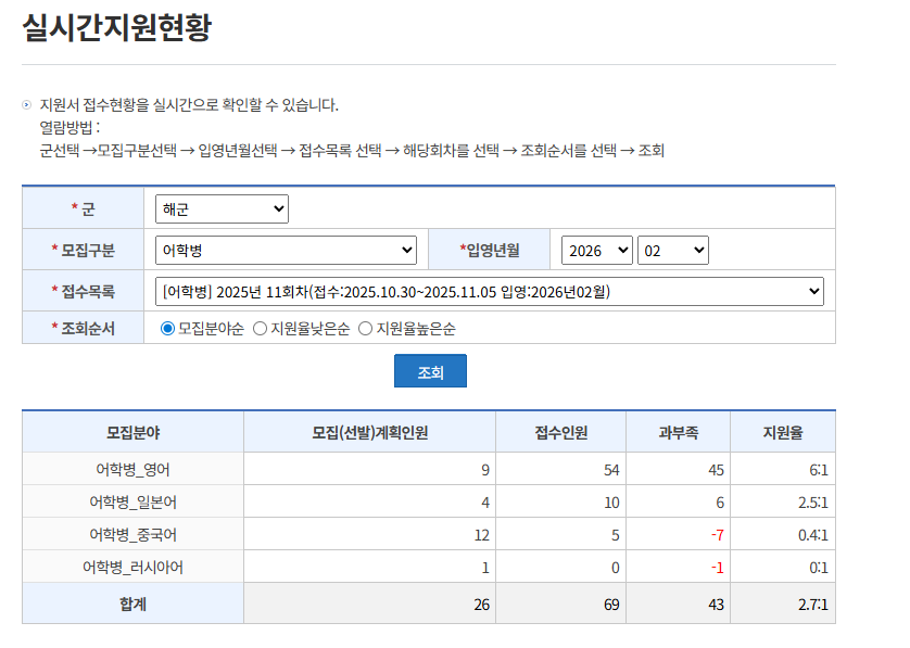 해군어학병 2025년 11회차 지원현황입니다. (현재 시각 11월 4일 오전 8시 41분 접수 중)