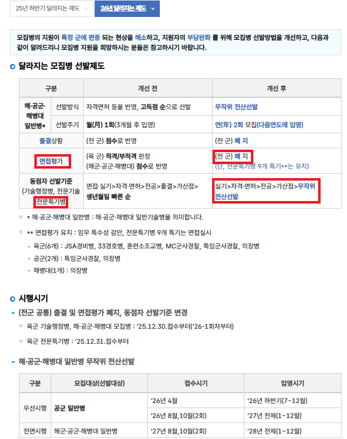 이와 함께 전군 모집병 선발에서 고교 출결 상황 점수 반영을 폐지하고, JSA경비병과 의장병 등 일부 전문특기병을 제외한 전군 모집에서 면접 평가도 없애기로 했다.