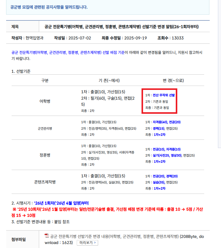 공군 전문기술병과 전문특기병은 기존과 같이 자격·면허 점수 합산에 따른 고득점순 선발을 유지하며, 월별 모집도 계속된다.