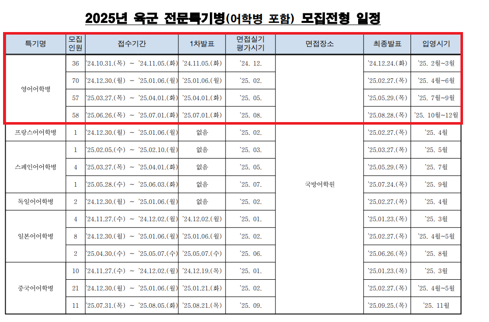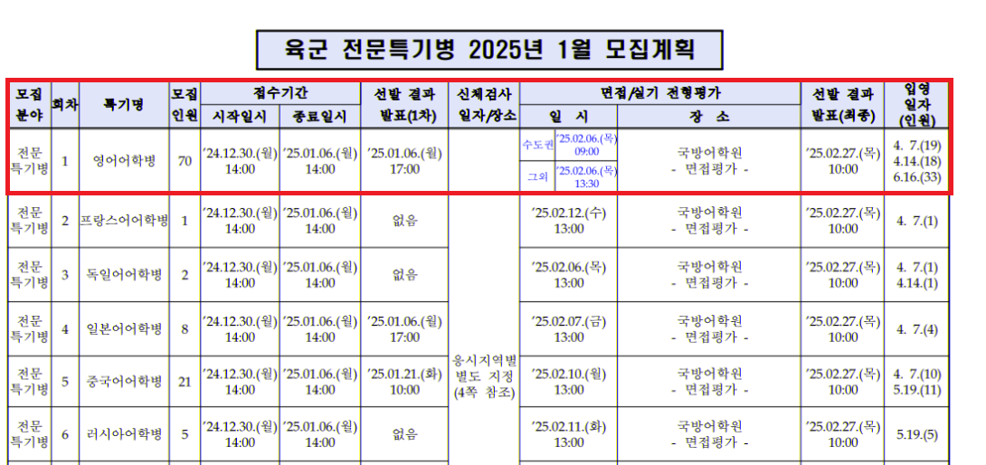 어학병은 지원선발병으로 지정된 입영일자에 입영하셔야 합니다. 이번 1월 육군 영어어학병 모집 입영일자는 다음과 같습니다.