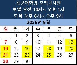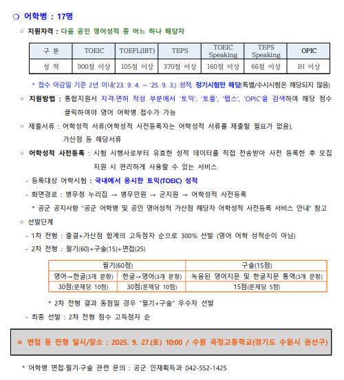 | 공군어학병 (25-9회차) 선발시험 공지 (지원접수 8/28~9/3, 2차시험 : 9월 27일(토)) (1) | 2025.08.21 |